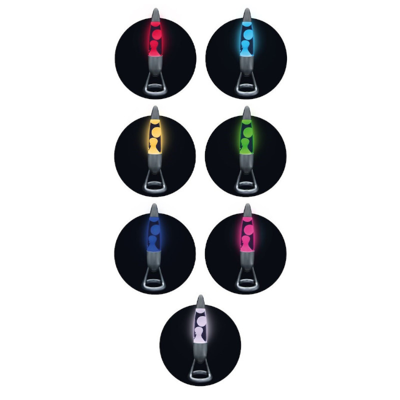 Φωτιστικό lava lamp με ύψος 35 εκ, ιδανικό για διακόσμηση του σπιτιού ή του γραφείου. Περιλαμβάνει αυτόματη κυκλική φωτεινότητα 7 χρωμάτων LED. Ασφαλής μεταλλική βάση, δεν καίει κατά την επαφή. Λειτουργεί με τον συμπεριλαμβανόμενο μετασχηματιστή.
