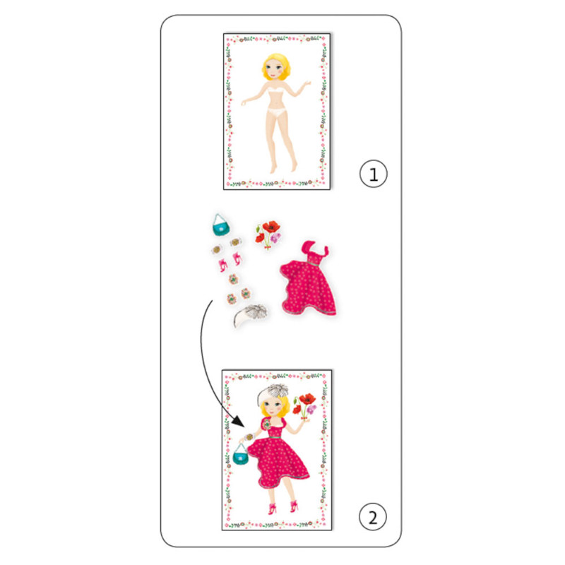 Αν λατρεύετε την μόδα το σετ με τα αυτοκόλλητα της εταιρίας Djeco θα γίνει το αγαπημένο σας παιχνίδι! Περιλαμβάνει 8 κάρτες με φιγούρες και 4 φύλλα με αυτοκόλλητα που μπορείτε να χρησιμοποιήσετε αρκετές φορές. Μπορείτε να το αποθηκεύσετε και να το μεταφέρετε εύκολα καθώς η συσκευασία του είναι σε μορφή φακέλου. Κατάλληλο από 4 έως 8 ετών. Διαστάσεις συσκευασίας: 22x 23x 1εκ.