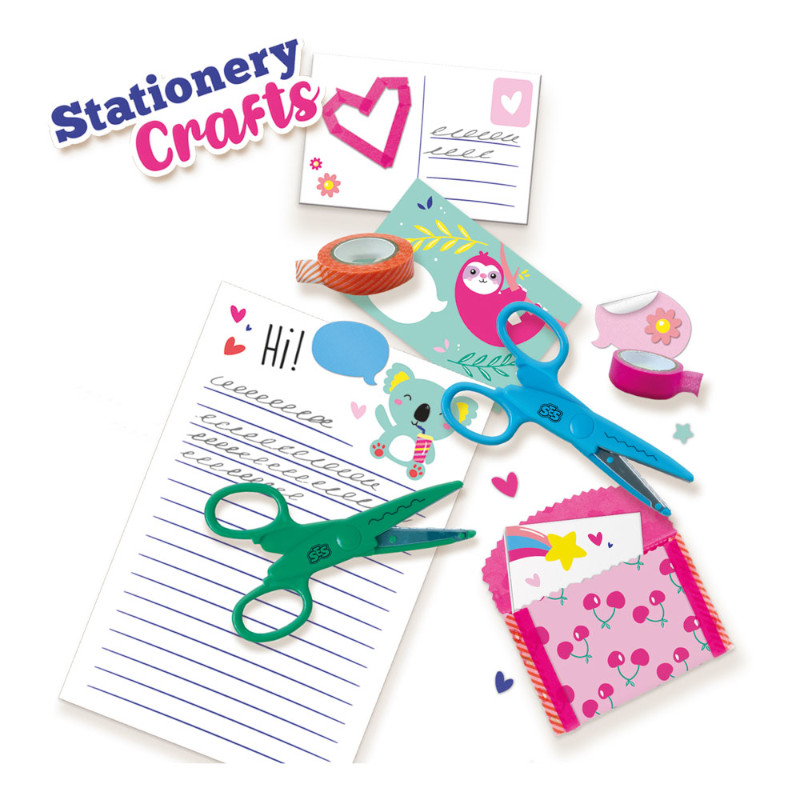 Αυτό το κιτ χειροτεχνίας περιέχει όλα όσα χρειάζεστε για να φτιάξετε το δικό σας χαρτί γραφής, φακέλους και καρτ ποστάλ. Για παράδειγμα, κάντε τις δικές σας προσκλήσεις για ένα πάρτι ή γράψτε ένα ωραίο γράμμα στη γιαγιά και τον παππού. Με τα δύο ζιγκ-ζαγκ ψαλίδια που περιλαμβάνονται, μπορείτε να κόψετε ωραίες άκρες στις κάρτες σας και με τα εγγράψιμα αυτοκόλλητα και την ταινία washi, μπορείτε να διακοσμήσετε την αλληλογραφία σας.