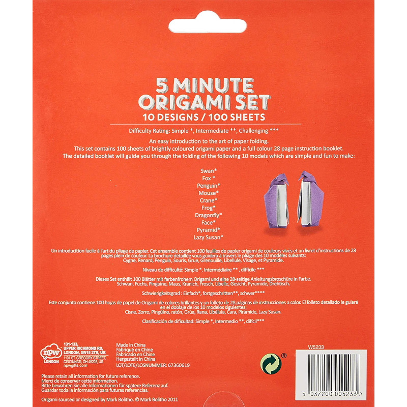 Εισαγωγή στην τέχνη του Οριγκάμι, με 10 οδηγίες για να φτιάξεις ζωάκια και 100 φύλλα για ποικιλία χρωμάτων.