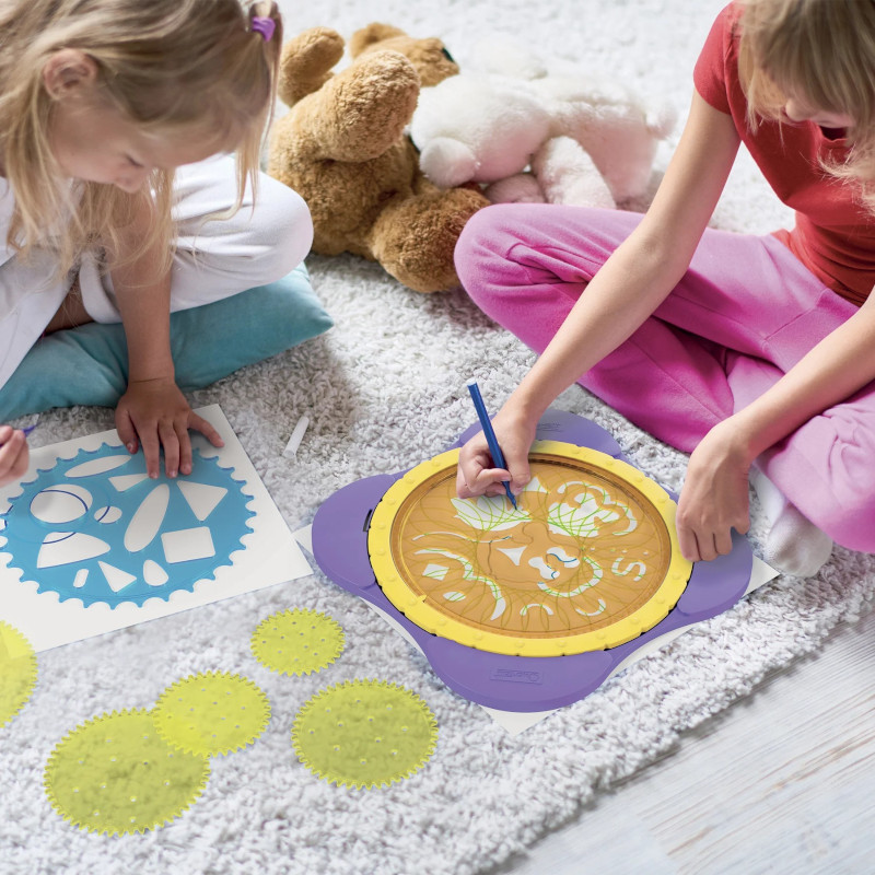 Με το Spirogiro μπορείτε εύκολα να δημιουργήσετε γεωμετρικά σχέδια που θα ήταν πολύ δύσκολο να τραβήξετε με το χέρι μέσω του στροβιλισμού. Αυτό το εκπληκτικό σετ περιλαμβάνει τρεις διαφορετικούς τύπους περιστρεφόμενων οδοντωτών τροχών που θα σας εκπλήξουν με ατελείωτες διαμορφώσεις: με τα μικρά κίτρινα γρανάζια μπορείτε να φτιάξετε όλα τα είδη των σπειροειδών διακοσμήσεων, με το μπλε γρανάζι μπορείτε να δημιουργήσετε όμορφους γεωμετρικούς κύκλους, και τέλος, με το πορτοκαλί εργαλείο μπορείτε να σχεδιάσετε το δικό σας πολύχρωμο Mandala. Το παιχνίδι αυτό ενθαρρύνει τη δημιουργικότητα και τις καλλιτεχνικές δεξιότητες, ενώ παράλληλα αναπτύσσει εξαιρετικές κινητικές δεξιότητες και συντονισμό.Ενισχύει τη Φαντασία και τη Δημιουργικότητα.