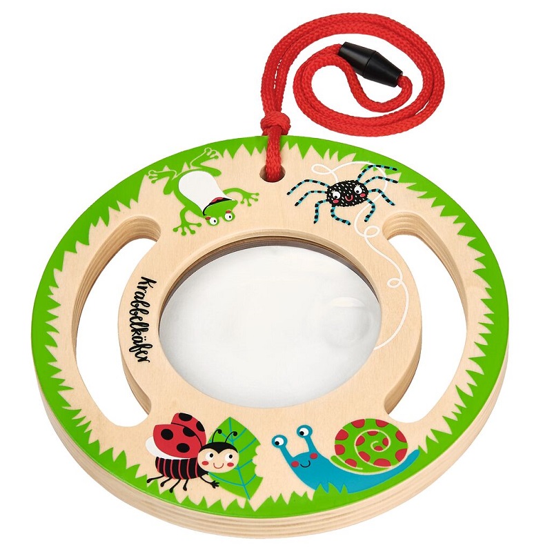 Μεγάλος μεγεθυντικός φακός με μεγέθυνση 2x, με πρόσθετο μίνι γυαλί μεγέθυνσης 4x για λεπτομέριες. Διαθέτει δύο τρύπες για λαβή και κορδόνι ασφαλείας. Διάμετρος 18 cm (Τρύπα διαμέτρου 9 cm) κατασκευασμένο από ξύλο. Κατάλληλο για παιδιά 24 μηνών και άνω.
