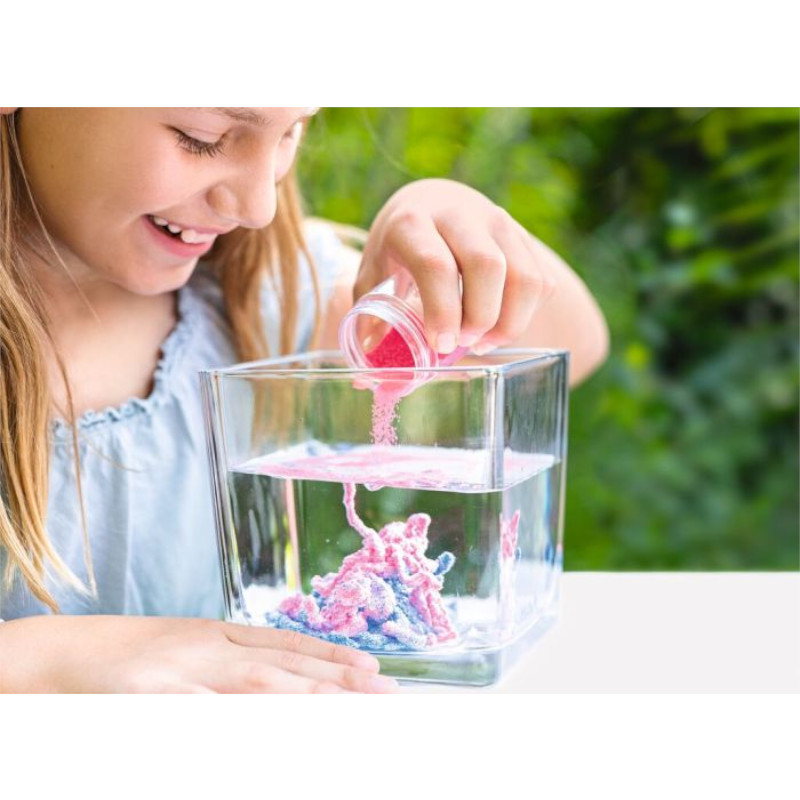 Παράξενα σχήματα κάτω από το νερό και στεγνή άμμος στον αέρα: Η μαγική Space Sand εγγυάται συναρπαστική διασκέδαση για τα παιδιά! Όταν ρίξετε τη χρωματιστή άμμο στο νερό, δημιουργούνται τρελά σχήματα. Όταν τη βγάλετε έξω, είναι εντελώς στεγνή, σαν να έγινε μαγικό! Αλλά γιατί η μπλε, πράσινη, ροζ ή μωβ άμμος παραμένει στεγνή; Τα παιδιά το μαθαίνουν στις συνοδευτικές πληροφορίες για το επιστημονικό φαινόμενο της “υδρόφοβικής άμμου”.