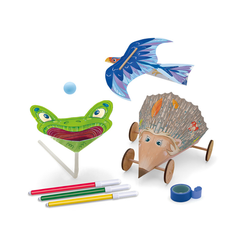 Η νέα, πρωτοποριακή σειρά «Lab & Craft», της αγαπημένης μας Ludattica έχει υλοποιηθεί σε συνεργασία με το μουσείο των παιδιών στη Ρώμη «EXPLORA», ώστε να προωθήσει την εκμάθηση των S.T.E.M. σε παιδιά μικρής ηλικίας, βοηθώντας τα να αναπτύξουν τις απαραίτητες αυτές δεξιότητες μέσω του παιχνιδιού και της διασκέδασης. Με το «Air Machines» τα παιδιά εισάγονται στην έννοια της αεροδυναμικής, φτιάχνοντας κατασκευές που δουλεύουν, εκμεταλλευόμενες τον αέρα. Ο μικρός σκαντζόχοιρος τρέχει σαν τον άνεμο, το χάρτινο χελιδόνι πετά ψηλά στον ουρανό, η μπαλίτσα μένει στον αέρα, πάνω από το στόμα του βατράχου! Ένα μοναδικό παιχνίδι διακόσμησης, χειροτεχνίας και κατασκευής που βοηθά τα παιδιά θα μάθουν τις βασικές αρχές της φυσικής μέσω πειραμάτων. Περιεχόμενα: χαρτόνια για το σκαντζόχοιρο και το βάτραχο, χαρτί για το χελιδόνι, 4 τροχοί, 2 άξονες, 1 ξυλάκι, 5 μαρκαδόροι, 2 χάρτινα καλαμάκια, ταινία, 1 μπάλα, 1 καρούλι κλωστής, εκπαιδευτικό εγχειρίδιο οδηγιών. Διαστάσεις συσκευασίας: 22.5 x 22.5 x 7.5 εκ.