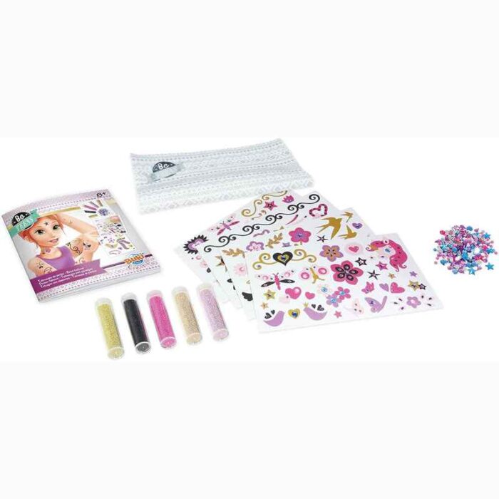 Επιλέξτε το σχέδιό που σας αρέσει από την μεγάλη ποικιλία που περιέχεται στη συσκευασία, διακοσμήστε το χρησιμοποιώντας τις μίνι χάντρες και κολλήστε το τατουάζ στο δέρμα σας, για μια μοντέρνα εμφάνιση!