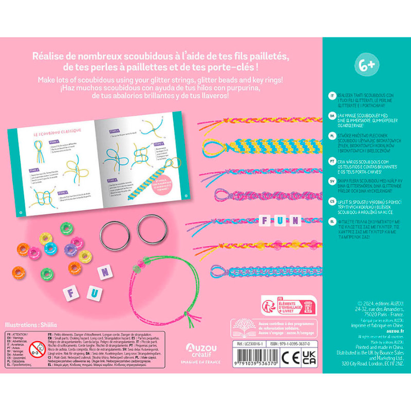 Τα φημισμένα «scoubidous» βραχιολάκια των 80s επιστρέφουν δυναμικά στη μόδα! Στο νέο παιχνίδι της αγαπημένης μας Auzou, θα βρείτε πάνω από 50 χρωματιστά κορδόνια με γκλίττερ και λεπτομερείς οδηγίες στα ελληνικά για το πώς μπορείτε να φτιάξτε 5 διαφορετικά σχέδια scoubidous για να φορέσετε, να διακοσμήσετε τις τσάντες και τα σακίδιά σας ή να χαρίσετε στους αγαπημένους σας φίλους. Αφήστε τη φαντασία σας ελεύθερη και δημιουργήστε τα πιο τρελά και ευφάνταστα σχήματα και τους πιο υπέροχους χρωματικούς συνδυασμούς! Διαστάσεις συσκευασίας: 24.5 x 3 x 20 εκ.