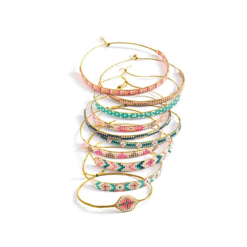 Φτιάξτε ευφάνταστες δημιουργίες από πολύχρωμα βραχιόλια και δωρίστε τα στους φίλους σας αλλά και σε εσάς. Ένα υπέροχο σετ από την εταιρεία Djeco που περιλαμβάνει 8 θήκες με χάντρες σε διάφορα χρώματα, 1 βελόνα, 1 σχοινάκι και ένα βοηθητικό πλαίσιο για τις κατασκευές σας. Κατάλληλο για παιδιά ηλικίας από 8 ετών και άνω. Διαστάσεις συσκευασίας: 21 x 24 x 2,5 εκ.