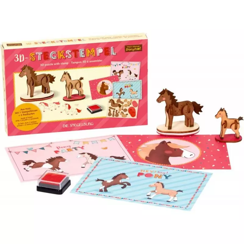 Για χειροτεχνία και παιχνίδι: Με αυτό το σετ μπορείτε να συναρμολογήσετε μόνοι σας δύο χαριτωμένες ξύλινες φιγούρες πόνυ. Η βάση του μεγαλύτερου πόνυ γίνεται σφραγίδα, με την οποία μπορείτε να σφραγίσετε ένα χαριτωμένο μοτίβο πόνυ. Περιλαμβάνεται επίσης στο σετ: ένα μελάνι και τρεις καρτ ποστάλ.
