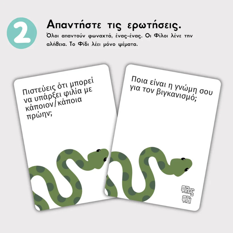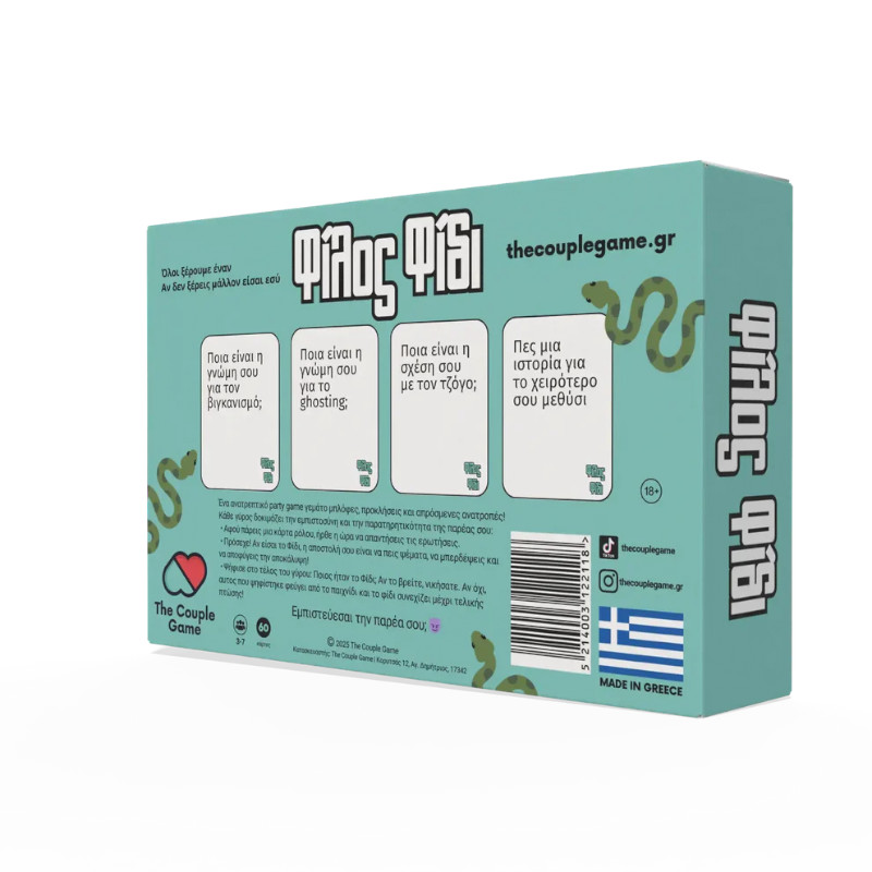 Το “Φίλος Φίδι” είναι ένα party game ρόλων για παρέες που λατρεύουν το δράμα και τις ανατροπές! Πες ψέματα αν τολμάς, αλλά πρόσεχε… Αν σε καταλάβουν, το παιχνίδι σου τελειώνει!