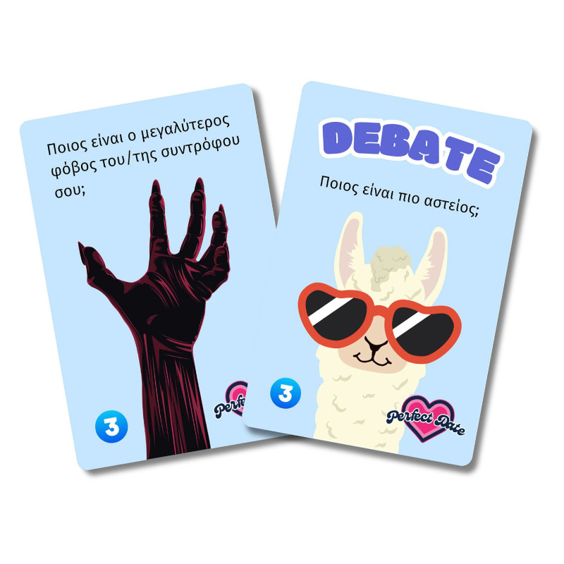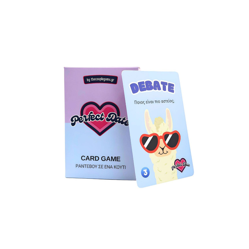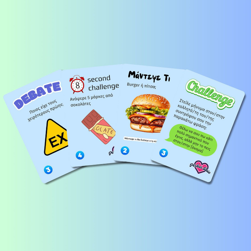Το Perfect Date είναι ένα διασκεδαστικό και χαλαρό επιτραπέζιο παιχνίδι για ζευγάρια ή φίλους, όπου οι παίκτες προσπαθούν να δημιουργήσουν την τέλεια ρομαντική ή φιλική εμπειρία μέσα από μια σειρά από επιλογές και προκλήσεις. Ο στόχος είναι να δημιουργήσετε την καλύτερη δυνατή “ημερομηνία” ή “έξοδο”, επιλέγοντας δραστηριότητες, τοποθεσίες και ιδέες που να ταιριάζουν με τα ενδιαφέροντα και τις προτιμήσεις σας.