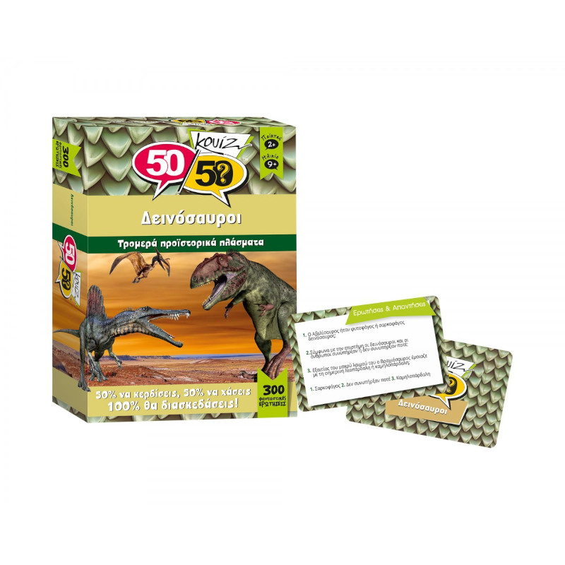 Ο Τυραννόσαυρος Ρεξ είχε περίπου 60 ή 40 δόντια που το καθένα είχε μήκος περίπου 30 εκατοστά; Ο Κεντρόσαυρος ήταν φυτοφάγος ή σαρκοφάγος δεινόσαυρος; Ταξίδεψε στην εποχή των δεινοσαύρων και γνώρισε τα τρομερά προϊστορικά πλάσματα! Τέσταρε τις γνώσεις σου και συναγωνίσου τους φίλους σου με το νέο επιτραπέζιο παιχνίδι ερωτήσεων 50-50 Κουίζ Δεινόσαυροι! Με 300 ερωτήσεις που καλύπτουν ποικίλα θέματα, μαθαίνεις τις πιο ενδιαφέρουσες και αξιοπερίεργες πληροφορίες για τους δεινόσαυρους.