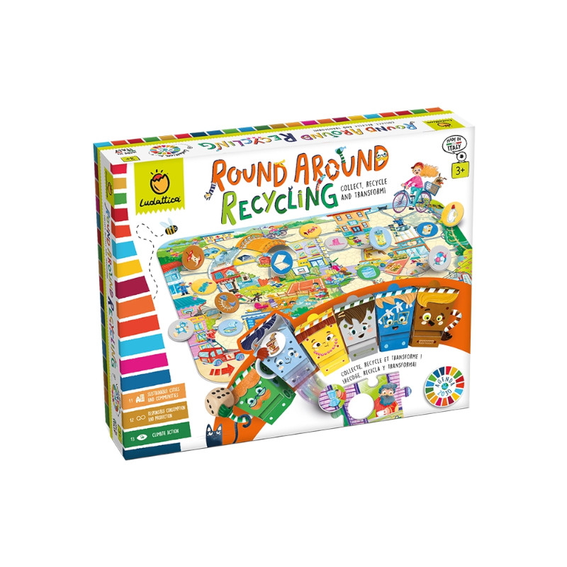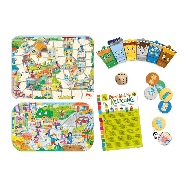Το «Round Around Recycling» μαθαίνει στα παιδιά τη σημασία και τη μαγεία της ανακύκλωσης! Χρησιμοποιείστε τους ειδικούς κάδους και μετατρέψτε τα απορρίμματα σε πολύτιμα νέα αντικείμενα και υλικά. Το ιδανικό επιτραπέζιο για να βοηθήσετε τα παιδιά να αναπτύξουν, παράλληλα με τη λογική σκέψη τους, και τη περιβαλλοντική τους ευαισθησία.
