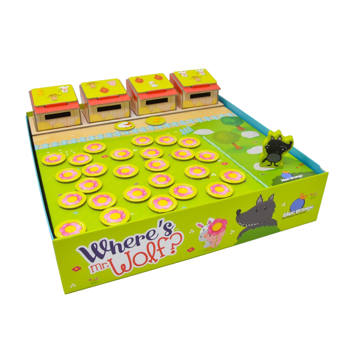 Περιεχόμενα: – 1 ταμπλό παιχνιδιού – 4 σπίτια – 28 σύμβολα ζώων – 14 κάρτες ζώων (8 “κάρτες με 3 ζώα” και 6 “κάρτες με 4 ζώα”) – 1 μικρή φιγούρα “Mr. Wolf”