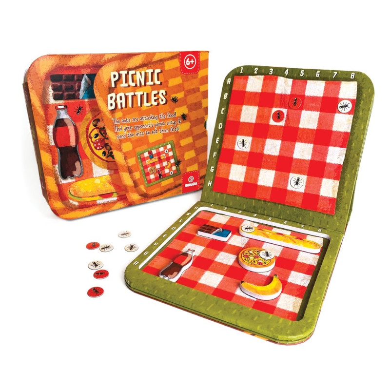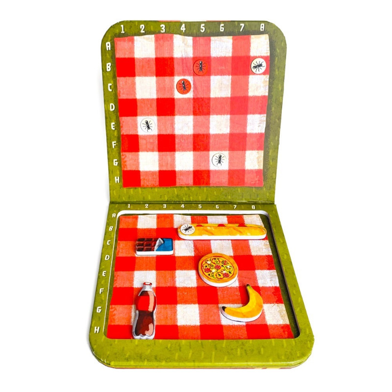 Ετοιμαστείτε για πικ-νικ! Ανοίξτε το καλάθι σας και τοποθετήστε στο κόκκινο καρό τραπεζομάντηλο το φαγητό σας! Αλλά προσέξτε! Τα μυρμήγκια καραδοκούν και είναι έτοιμα να καταβροχθίσουν όλα τα τρόφιμά σας! Ανακαλύψτε που έχει τοποθετήσει ο αντίπαλός σας τα δικά του τρόφιμα και στείλτε πρώτα σε εκείνον τα μυρμήγκια να τα φάνε! Ένα μαγνητικό παιχνίδι για 2 παίκτες που θα αναπτύξει την στρατηγική σκέψη σας αλλά και θα σας ανοίξει την όρεξη! Περιλαμβάνει 2 μαγνητικά ταμπλό, 2 σετ με μαγνητικά φαγητά και 170 μυρμήγκια. Κατάλληλο για παιδιά άνω των 6 ετών.