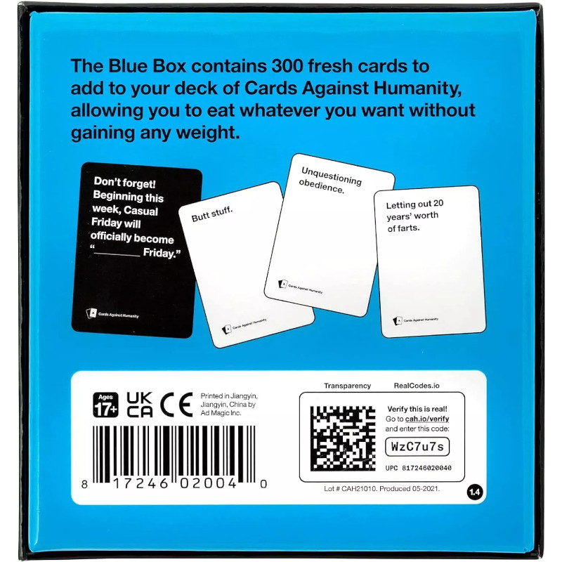 Το Blue Box συνοδεύεται από 300 φρέσκιες κάρτες, για να τις προσθέσετε στην τράπουλα σας με τις Cards Against Humanity, επιτρέποντάς σας να φάτε ό,τι θέλετε χωρίς να πάρετε βάρος.