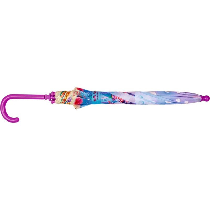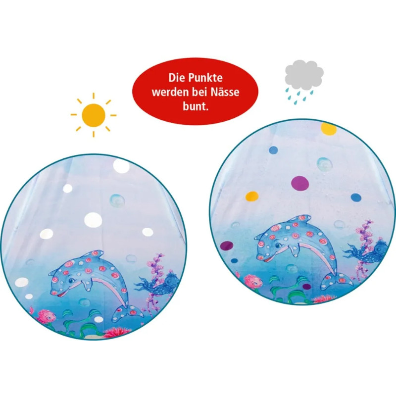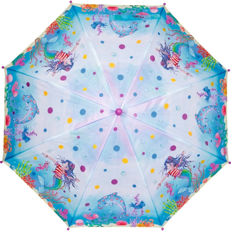 Με αυτήν την ομπρέλα, οι φίλοι της Nella Nixe, μικροί και μεγάλοι, παραμένουν στεγνοί. Όταν βραχεί, οι κουκκίδες γίνονται πολύχρωμες ως δια μαγείας! Η ομπρέλα από ανακυκλωμένο πολυεστέρα έχει διάμετρο περίπου. 83 cm, και η πλαστική λαβή χωράει με ασφάλεια στα μικρά παιδικά χέρια. Εγγύηση για τη μαγεία της βροχής!