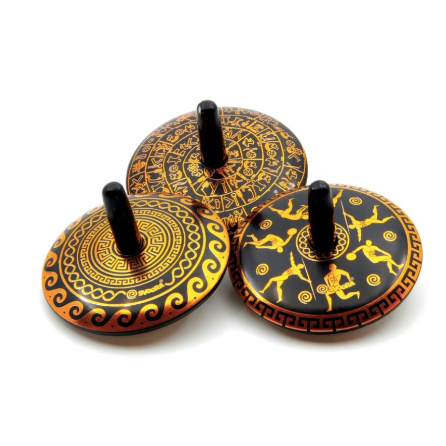 Μεταλλικές συλλεκτικές σβούρες με θέματα “Δίσκος της Φαιστού”,”Μαίανδρος”,και “Ολυμπιακοί Αγώνες”. Έχουν μαύρη επικάλυψη και χρυσά στοιχεία.