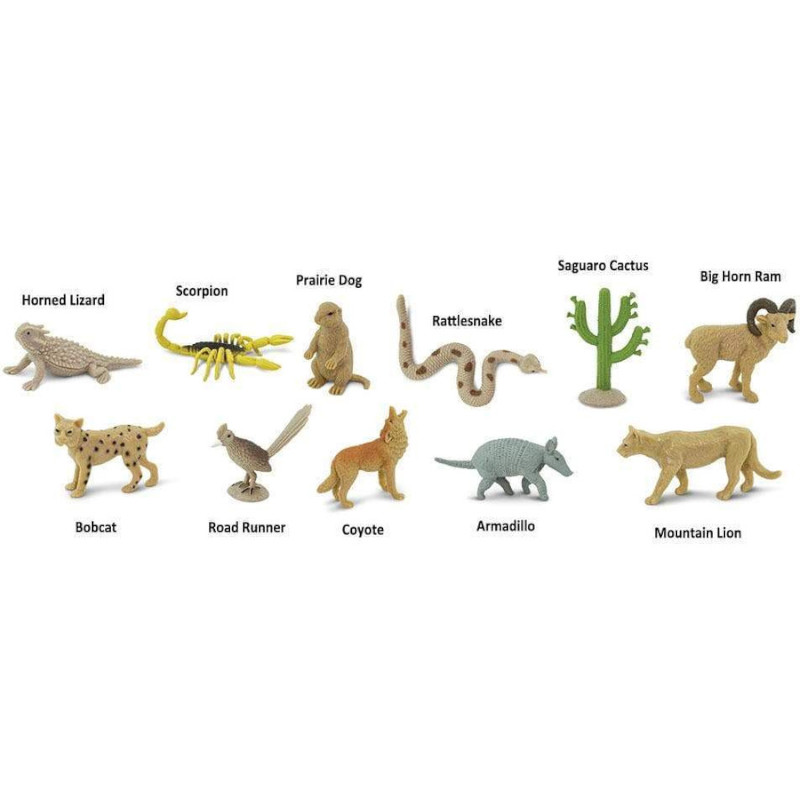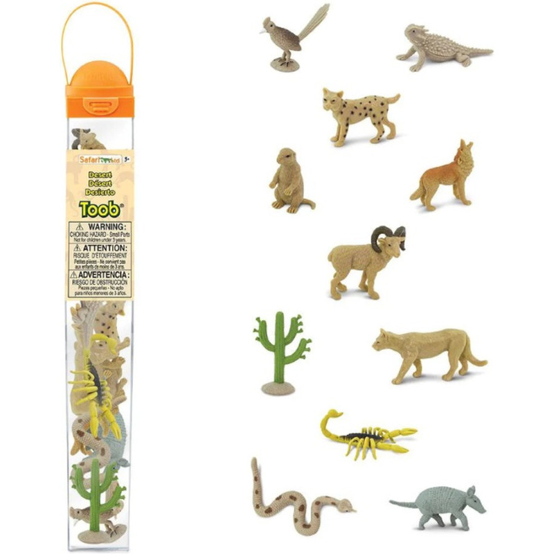 Αν και πολλές έρημοι είναι καυτές και στερούνται βροχοπτώσεων, αυτές οι μορφές άγριας ζωής καταφέρνουν να ζουν εκεί. Αυτό το Toob περιέχει μια κερασφόρα σαύρα, εκκολαπτόμενο κάκτο saguaro, δρομέα δρόμου, σκορπιό, κροταλία, κογιότ, μεγάλο κριάρι κέρατο, bobcat, armadillo, λιοντάρι του βουνού και σκύλο λιβάδι.