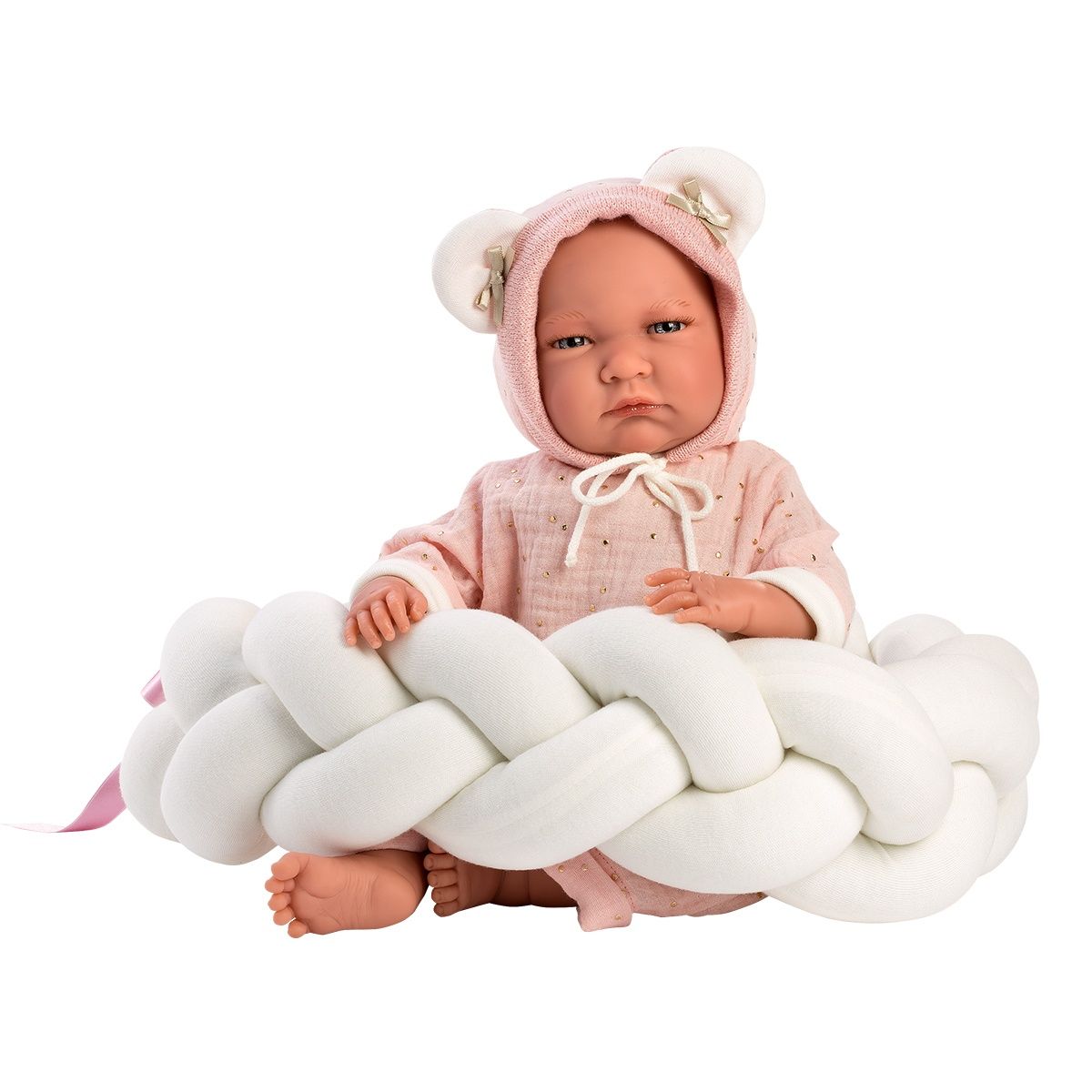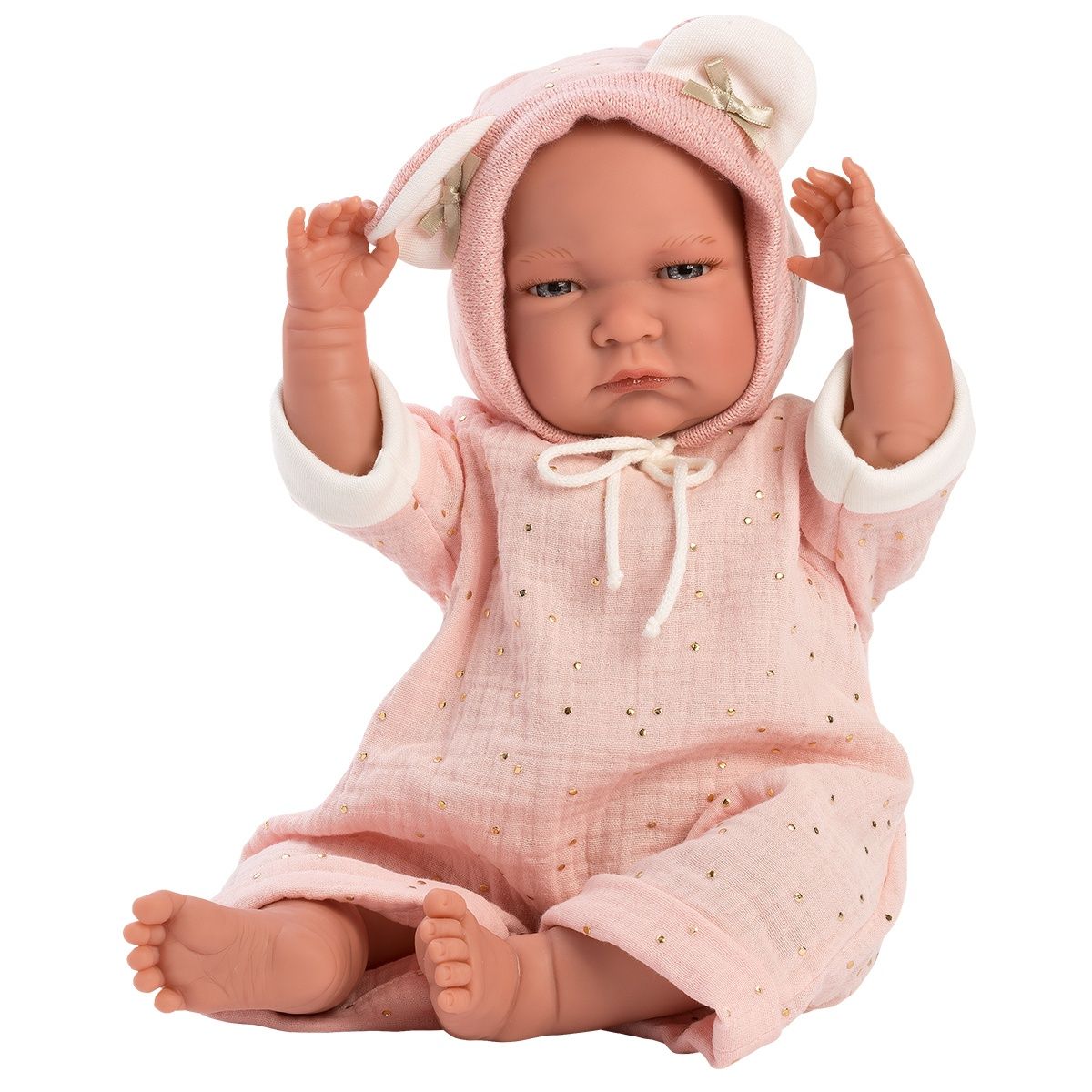 Η Recien φοράει ένα ροζ φορμάκι μουσελίνας με χρυσές κουκκίδες και σκουφάκι με αυτάκια. Το σετ κούκλας περιλαμβάνει ένα πολύ χαριτωμένο αξεσουάρ μία “φωλίτσα” από λευκή πλεξούδα. Η υφασμάτινη κοιλιά της κούκλας είναι γεμάτη με μαλακή επένδυση και όταν πατηθεί, η κούκλα θα αρχίσει να κλαίει. Αυτό το όμορφο χαριτωμένο πρόσωπο θα ευχαριστήσει όλους.