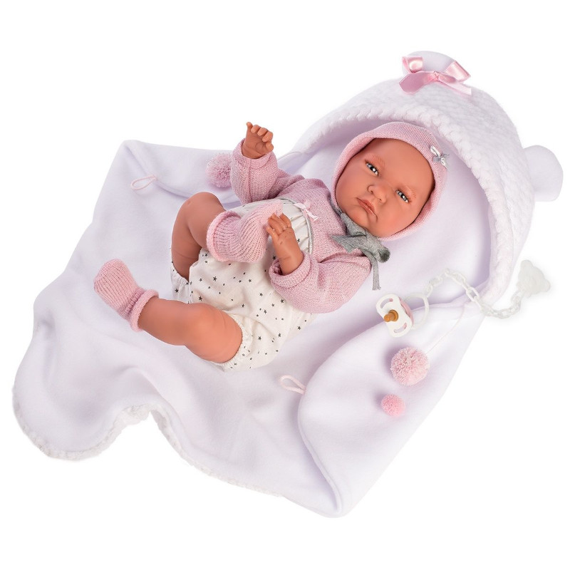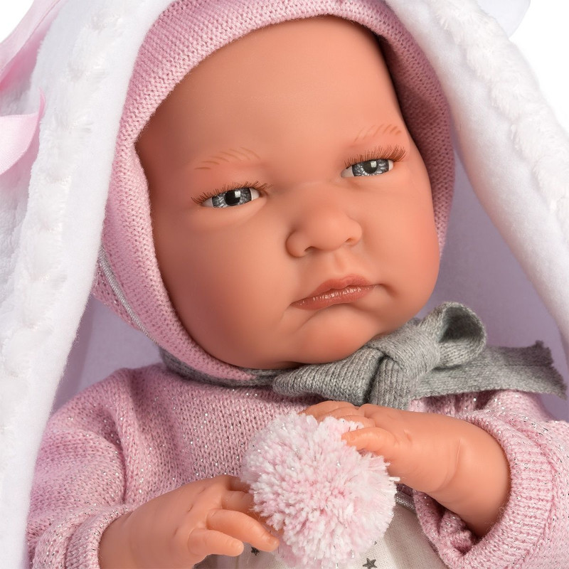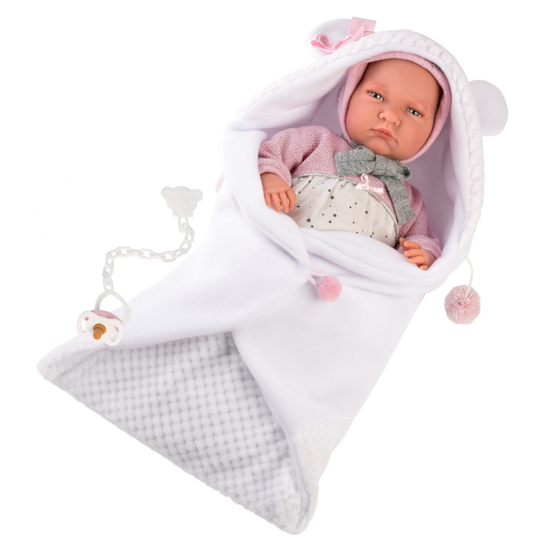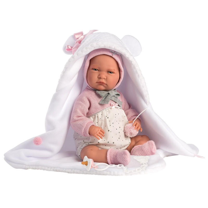 Μία κούκλα μωρό, ρεαλιστική, 42 εκατοστών, κατασκευασμένη στην Ισπανία, από την Llorens, είναι ένα μοναδικό παιχνίδι για παιδιά όλων των ηλικιών. Φοράει κορμάκι με άνοιγμα και φιόγκο, ροζ κάλτσες και ροζ σκουφάκι δεμένο με γοητευτικό γκρι φιόγκο. Η στολή κουμπώνει με Velcro στο πίσω μέρος, κάνοντας το ντύσιμο του μωρού εύκολο. Περιλαμβάνεται μία κουβερτούλα με αυτιά αρκούδας. Η υφασμάτινη κοιλιά της κούκλας είναι γεμισμένη με απαλή επένδυση. Όταν πιεστεί, η κούκλα θα κλάψει. Κάθε παιδί θα λατρέψει αυτό το αξιολάτρευτο, βρεφικό πρόσωπο. Η κούκλα έχει μπλε μάτια, μακριές βλεφαρίδες και μια γλυκιά μικρή μυτούλα. Τα μάτια της δεν κλείνουν. Τα χέρια και τα πόδια κινούνται, διευκολύνοντας την τοποθέτηση της κούκλας όπως θέλετε. Η πιπίλα που περιλαμβάνεται χρησιμεύει ως διακοσμητικό αξεσουάρ.