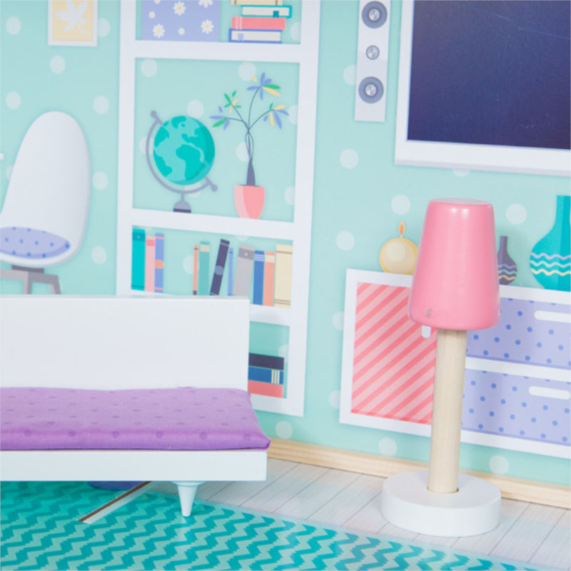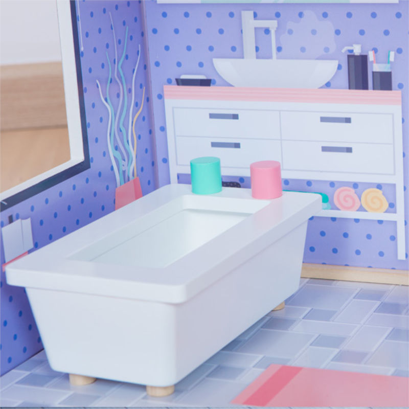 Ενα ΤΕΡΆΣΤΙΟ ξύλινο τριώροφο κουκλόσπιτο με πολλά δώματια, ακόμα και ασανσέρ! Το εσωτερικό του είναι διακοσμημένο με ζωγραφισμένες λεπτομέρειες. Περιλαμβάνει δέκα έπιπλα.