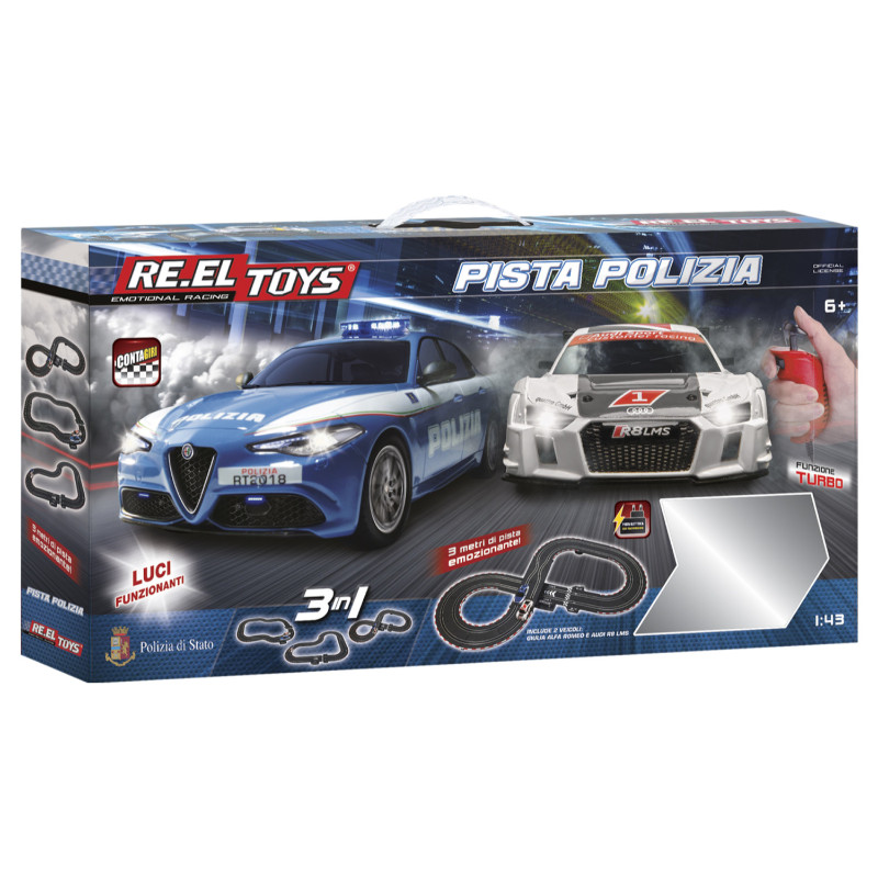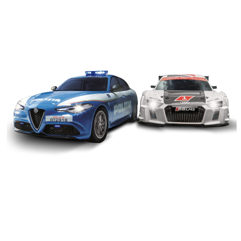 Εξαιρετικής ποιότητας, αυθεντικά αντίγραφα πολυτελών αυτοκινήτων, αγωνιστικό όχημα AUDI και περιπολικό Alpha Romeo σε κλίμακα 1:43 με φώτα, λεπτομερές εσωτερικό και λειτουργία TURBO, συνοδευόμενα από ηλεκτρική πίστα αγώνων. H πίστα έχει συνολικό μήκος 3 μέτρα και μπορεί να διαμορφωθεί με 3 διαφορετικούς τρόπους.