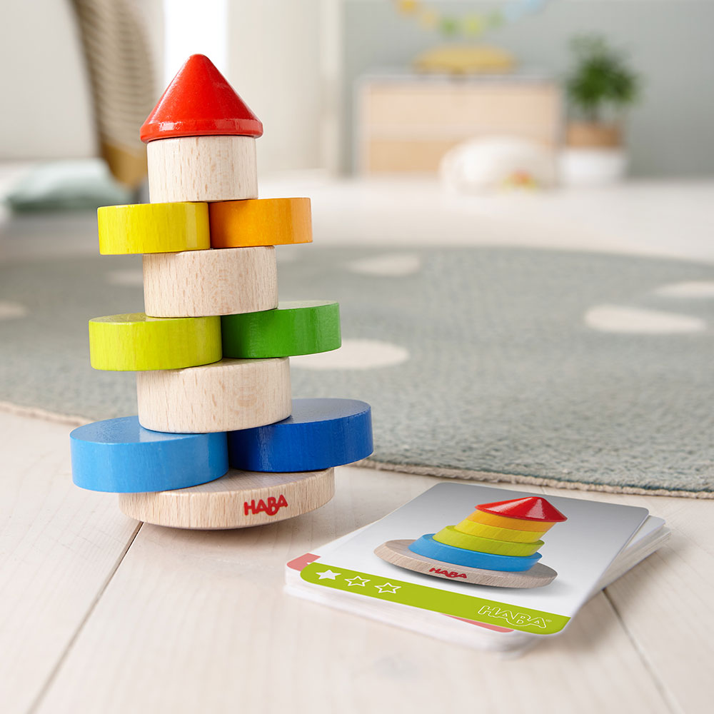 Ένας πύργος με τόσες πολλές δυνατότητες! Με αυτό το παιχνίδι στοίβαξης της εταιρείας Haba, τα παιδιά μπορούν να πειραματιστούν ελεύθερα και να δημιουργήσουν το δικό τους έργο είτε να αντιγράψουν τα έργα που προτείνονται στις κάρτες προκλήσεων. Ανεξάρτητα από το αν ο πύργος αναπτύσσεται κάθετα ή οριζόντια, το φανταστικό με αυτόν είναι ότι δεν ανατρέπεται. Το δημιουργικό αυτό εκπαιδευτικό παιχνίδι βοηθά στην ανάπτυξη της χωρικής κατανόησης, των λεπτών κινητικών δεξιοτήτων, βελτιώνοντας τον συντονισμό ματιού – χεριού. Αποτελεί επίσης εξαιρετικό μέσο εκμάθησης της στατικής ισορροπίας. Περιέχει: 1 δίσκος ταλάντευσης, 10 τουβλάκια στοίβαξης, 9 κάρτες δύο όψεων με προκλήσεις κλιμακούμενης δυσκολίας. Κατάλληλο για ηλικίες 2 ετών και άνω. Διαστάσεις: 23 x 15 x 4.5 εκ.