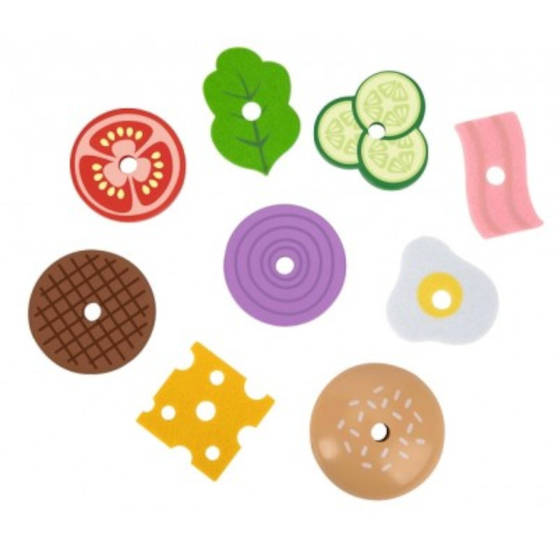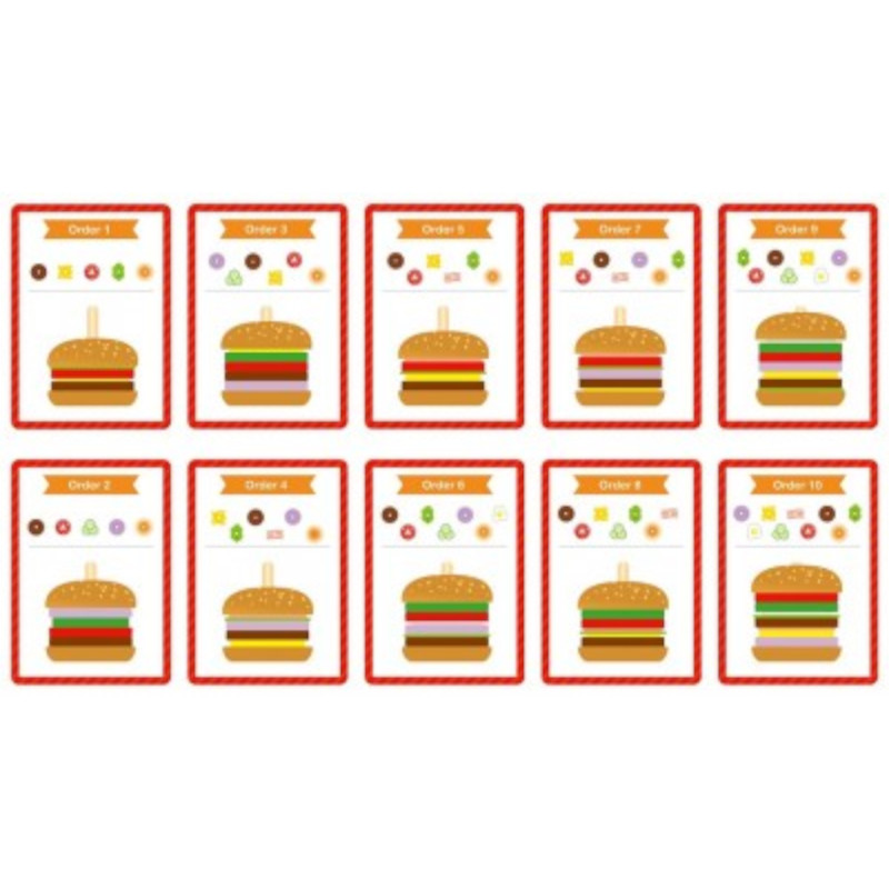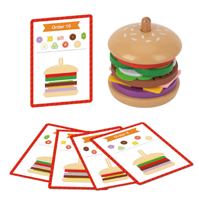 Το ξύλινο παιχνίδι μπέργκερ με κάρτες θα απασχολήσει δημιουργικά το παιδί, ενώ παράλληλα ενθαρρύνει την ανάπτυξη της οπτικής και συνδυαστικής αντίληψης, τις λεπτές κινητικές δεξιότητες και τον συντονισμό χεριού και ματιού. Επίσης, είναι μια μορφή παιχνιδιού που προσομοιώνει τις κοινωνικές σχέσεις και τις λειτουργίες της κοινωνίας, καθώς δίνεται η ευκαιρία στα παιδιά να πειραματιστούν με τη μαγειρική και να αλληλοεπιδράσουν με τους γύρω τους με αφορμή το φαγητό.