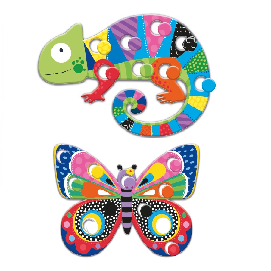 Μια πεταλούδα και ένας χαμαιλέοντας από μεγάλα κομμάτια και πολλές χρωματιστές μάρκες. Ένα εκπαιδευτικό παιχνίδι για μικρά παιδιά που θα τονώσει τη λογική σκέψη, τις λεπτές κινητικές δεξιότητες, την οπτική χωρική ικανότητα αλλά και τη μνήμη. Το σετ περιλαμβάνει 2 παζλ και 18 μάρκες. Διαστάσεις συσκευασίας: 24.5 x 24.5 x 4 εκ.