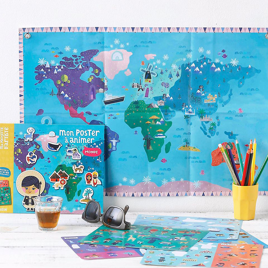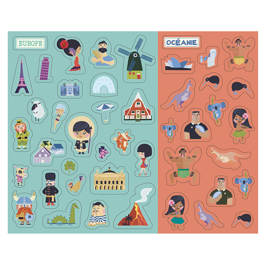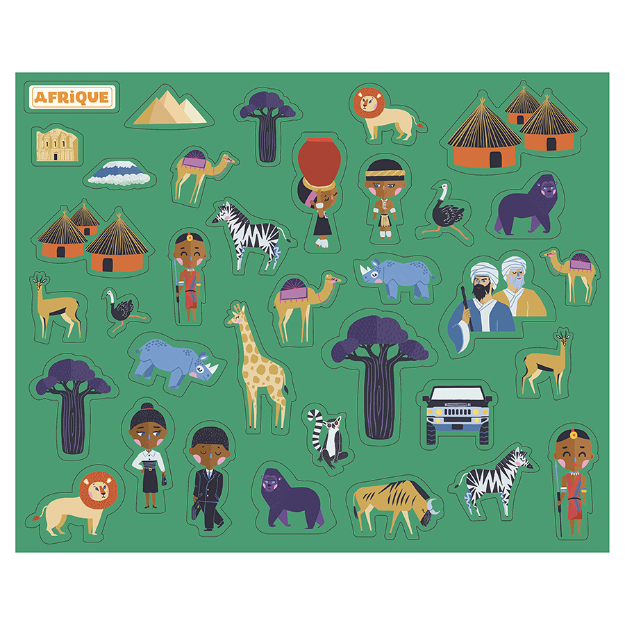 Ανακάλυψε τον κόσμο τοποθετώντας τα αυτοκόλλητα, με μνημεία, ζώα και παραδοσιακές ενδυμασίες, πάνω στο χάρτη. Το σετ περιλαμβάνει ένα χάρτη 57 x 38 εκ. που μπορείς να τον κρεμάσεις, 5 σελίδες με πάνω από 180 επανατοποθετούμενα αυτοκόλλητα και ειδικό χρωματικό κώδικα για την κάθε ήπειρο.