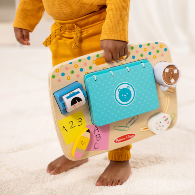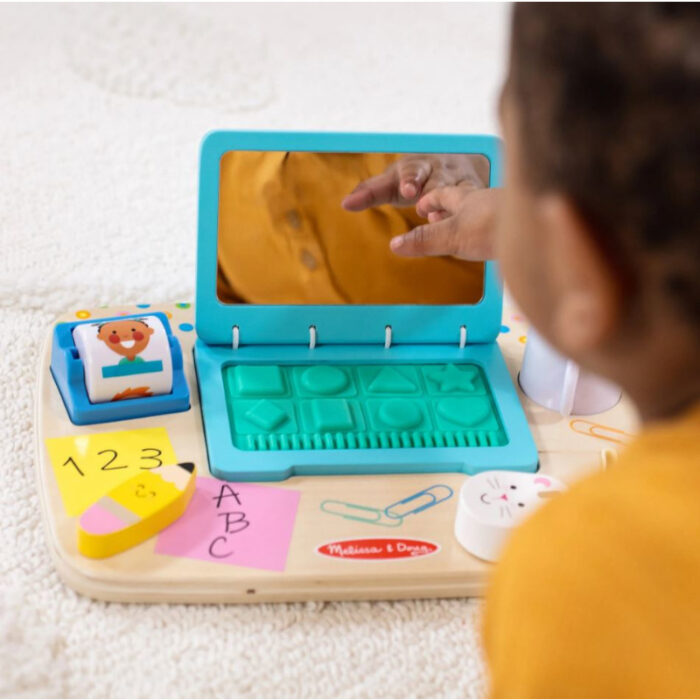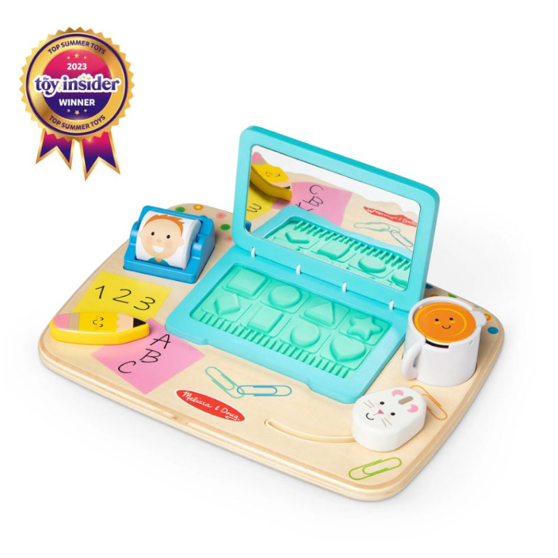 Τα νήπια θα διασκεδάσουν «εργαζόμενοι» ακριβώς όπως κάνουν οι μεγάλοι και ανακαλύπτοντας υφές και ήχους με έναν ξύλινο πίνακα δραστηριοτήτων επιφάνειας εργασίας με όλα τα προσαρτημένα κομμάτια και μια ενσωματωμένη λαβή. Ανοίξτε το καπάκι του φορητού υπολογιστή για να αποκαλύψετε έναν καθρέφτη και κουμπιά πληκτρολογίου σε σχήμα καουτσούκ για να τα αγγίξετε και να τα πατήσετε για να βοηθήσετε στην ανάπτυξη δεξιοτήτων λεπτής κινητικότητας και αναγνώρισης σχήματος Περιστρέψτε την κυλιόμενη λίστα επαφών για να ακούσετε τις χάντρες στο εσωτερικό να πέφτουν, περιστρέψτε το ξύλινο μολύβι, σύρετε το ξύλινο ποντίκι και γυρίστε το ένθετο της κούπας για ζεστή σοκολάτα ή χυμό.