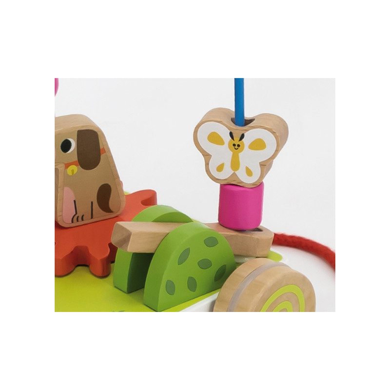 Όμορφες ξύλινες φιγούρες, όπως πεταλούδα, ήλιος, σύννεφο, πουλί, πασχαλίτσα και μέλισσα, τοποθετούνται σε πολύχρωμες μεταλλικές ράβδους, τις οποίες το παιδί μπορεί να κινήσει κατά βούληση και έτσι να εξασκήσει την ακρίβεια των δακτύλων και των χεριών. Στη βάση μιας από τις θηλιές υπάρχει ένας καταπέλτης που μπορεί να χρησιμοποιηθεί για να εκτοξεύσει τις χάντρες.