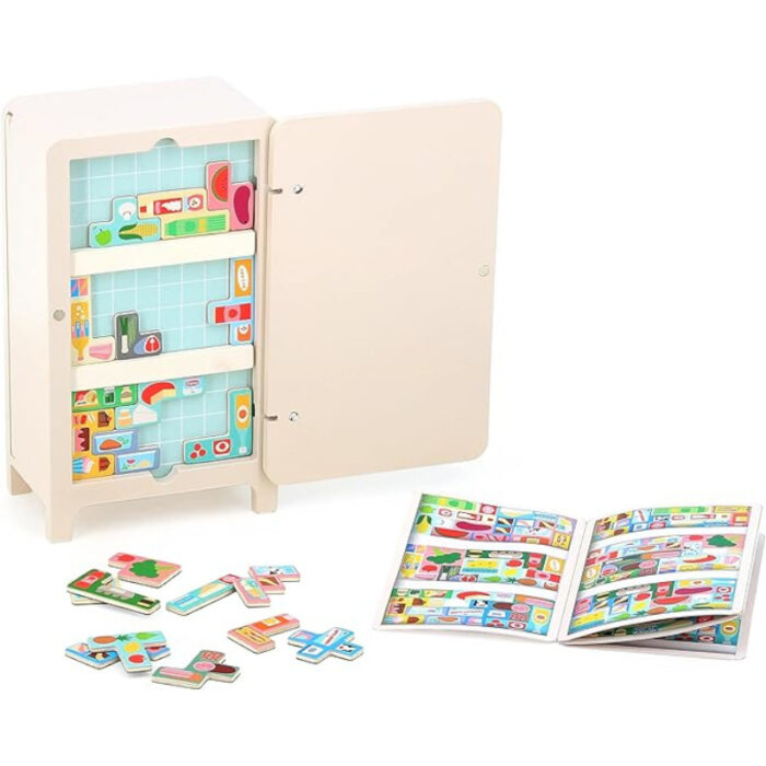 ΕΝΑ ΔΙΑΣΚΕΔΑΣΤΙΚΟ ΠΑΙΧΝΙΔΙ ΓΙΑ ΑΠΟΘΗΚΕΥΣΗ ΚΑΙ ΟΡΓΑΝΩΣΗ – Περιλαμβάνει 1 ξύλινο ψυγείο, 21 μαγνητικά τρόφιμα και 2 μαγνητικά ράφια, όπου το παιδί σας πρέπει να βελτιστοποιήσει τον χώρο και να αποθηκεύει σωστά τα τρόφιμα.