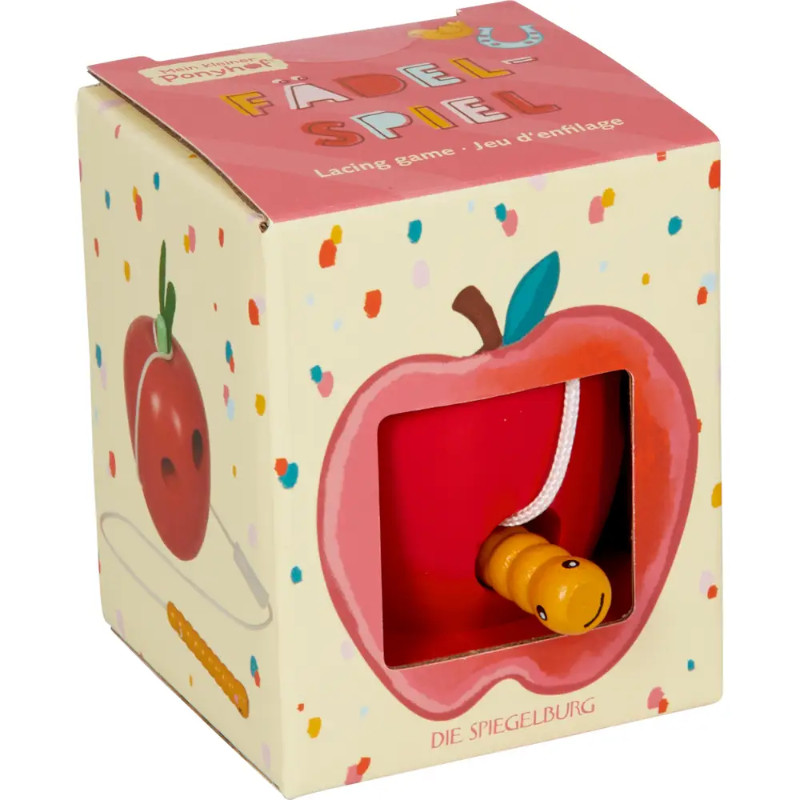 My Little Pony Farm: Αυτό το χαριτωμένο παιχνίδι με νήματα ( 9 EK ), από το Die Spiegelburg, προσφέρει στους λάτρεις των μικρών αλόγων, δημιουργική και εκπαιδευτική διασκέδαση. Το υπέροχα φτιαγμένο μήλο από ξύλο και τσόχα επιτρέπει στα παιδιά να εξασκούν παιχνιδιάρικα τις λεπτές κινητικές τους δεξιότητες καθώς περνούν το μικρό σκουλήκι μέσα από τις τρύπες. Ο πρακτικός σύνδεσμος στη χορδή διασφαλίζει ότι η χορδή δεν μπλέκεται – ιδανική για ξέγνοιαστο παιχνίδι! Με συνολικό μήκος περίπου 40 cm και διάμετρο μήλου περίπου 6,5 cm, αυτό το εύχρηστο σετ ταιριάζει τέλεια στα χέρια των μικρών παιδιών και μπορεί να αποθηκευτεί εύκολα. Στιβαρό και υψηλής ποιότητας, κατασκευασμένο από φυσικά υλικά όπως ξύλο, τσόχα και πλαστικό, αυτό το παιχνίδι με νήματα είναι ιδανικό για παιχνίδι στο σπίτι ή εν κινήσει.