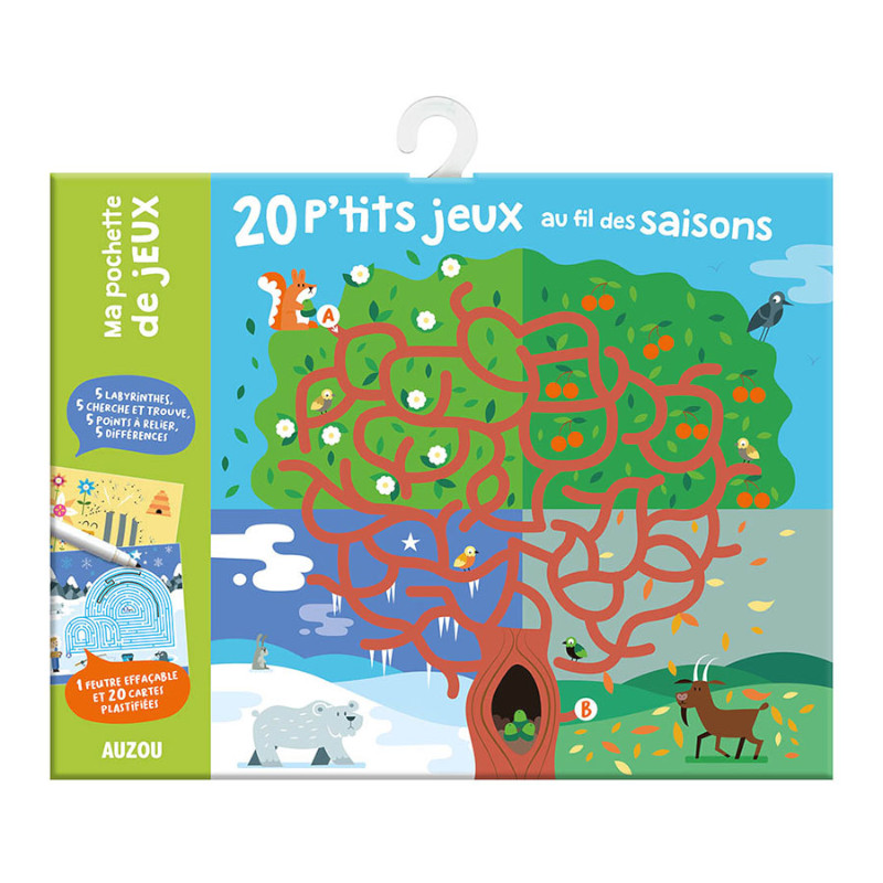 Με το σετ αυτό θα εξερευνήσετε όλες τις εποχές του χρόνου με τον πιο δημιουργικό τρόπο. Στη μια πλευρά των καρτών μπορείτε να διασκεδάσετε λύνοντας λαβύρινθους, παίζοντας ψάξε και βρες κι ενώνω τις τελείες. Στη συνέχεια γυρίστε τις κάρτες από την πίσω πλευρά και δημιουργήστε έναν τεράστιο λαβύρινθο. Το σετ περλαμβάνει 20 παιχνίδια, έναν ειδικό μαρκαδόρο γράψε-σβήσε, για να σβήνεις και να παίζεις ξανά και ξανά, και τις λύσεις των παιχνιδιών.