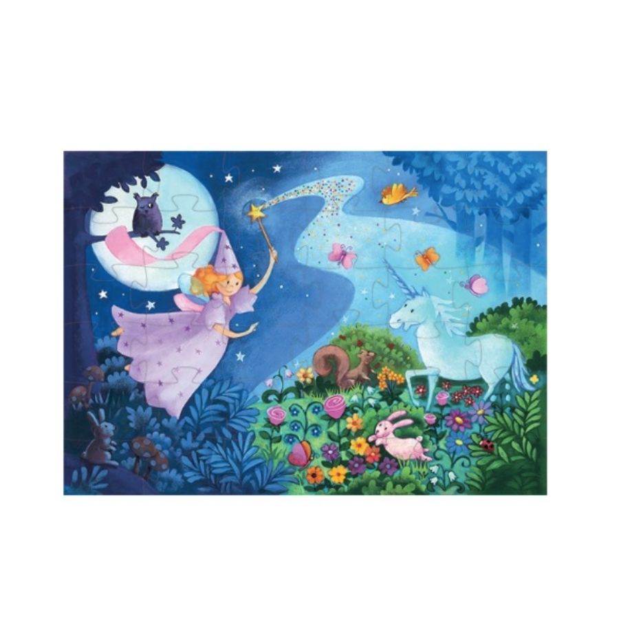 Η νεράιδα της εταιρίας Djeco με μια κίνηση του ραβδιού της μετατρέπει τη νύχτα σε μέρα! Ο μονόκερός της παίζει ανέμελα ανάμεσα στα λουλούδια, τις πεταλούδες και τα λαγουδάκια! Ένα παραμυθένιο παζλ 36 τεμαχίων, για παιδιά ηλικίας 4 ετών και άνω. Τα παιδιά προσχολικής ηλικίας θα ενθουσιαστούν και θα λατρέψουν αυτό το παζλ καθώς κομμάτι – κομμάτι θα το ενώνουν και θα αποκαλύπτεται το μοτίβο.