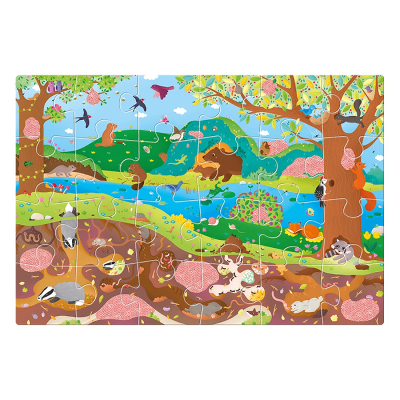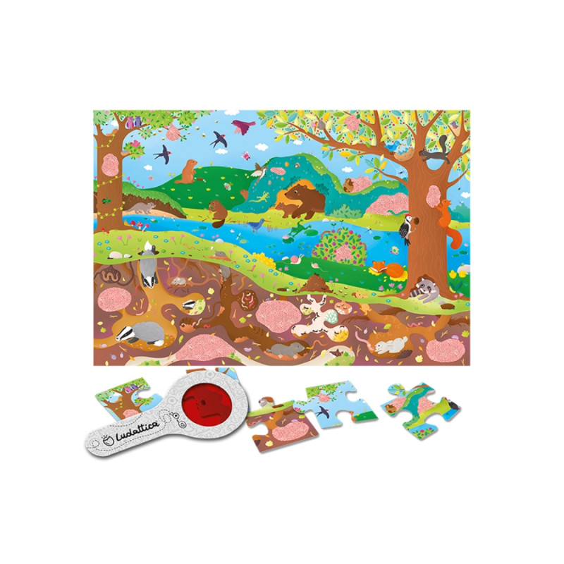 Το παιχνίδι αυτό περιλαμβάνει ένα παζλ 24 κομματιών με θέμα τoν μαγευτικό κόσμο της όμορφης Γης μας, πάνω και κάτω από την επιφάνεια της, κι ένα πρωτότυπο φακό για έξτρα διασκέδαση! Το παιδί συνθέτει το παζλ και στη συνέχεια με το φακό ανακαλύπτει διάφορες μικρολεπτομέρειες που κρύβονται, μέσα στην εικόνα, στα κομμάτια με την αχνή εικονογράφηση! Ένα διασκεδαστικό παιχνίδι που ενδυναμώνει τις λεπτές κινητικές δεξιότητες, τονώνει την περιέργεια και την παρατηρητικότητα και παράλληλα αυξάνει τη συγκέντρωση του παιδιού. Διαστάσεις συσκευασίας: 18 x 18 x 10 εκ. Διαστάσεις παζλ: 50 x 35 εκ. Ηλικία: Από 3 ετών.