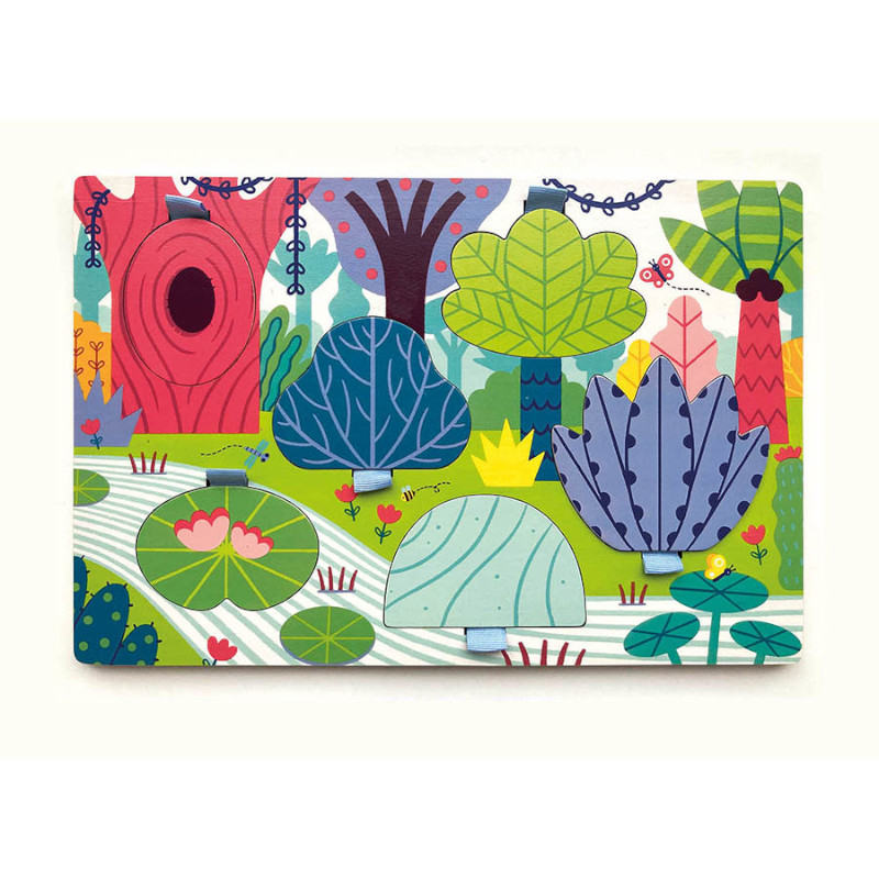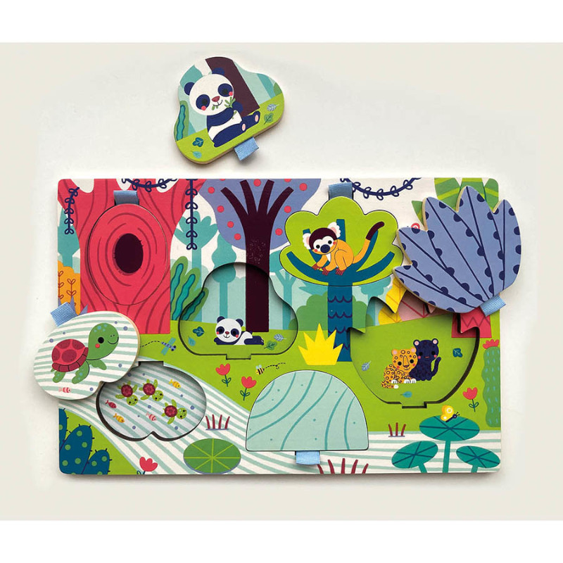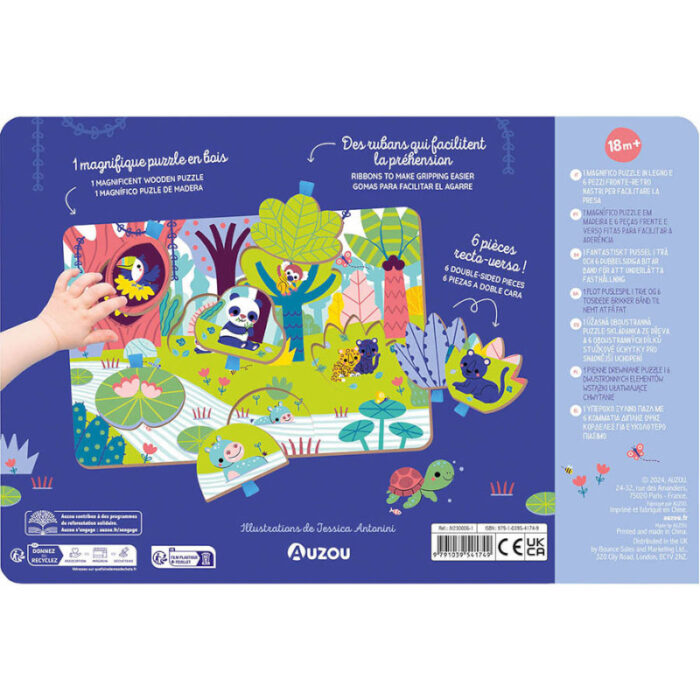 Ένα υπέροχο ξύλινο παζλ με 6 αποσπώμενα κομμάτια διπλής όψεως. Σηκώστε τα, τραβώντας τα από το εύχρηστο κορδονάκι που βρίσκεται στο πάνω μέρος τους, και αποκαλύψτε τα ζωάκια που κρύβονται από κάτω! Διαστάσεις συσκευασίας: 30 x 20 x 5 εκ. Ηλικία: Από 18 μηνών.
