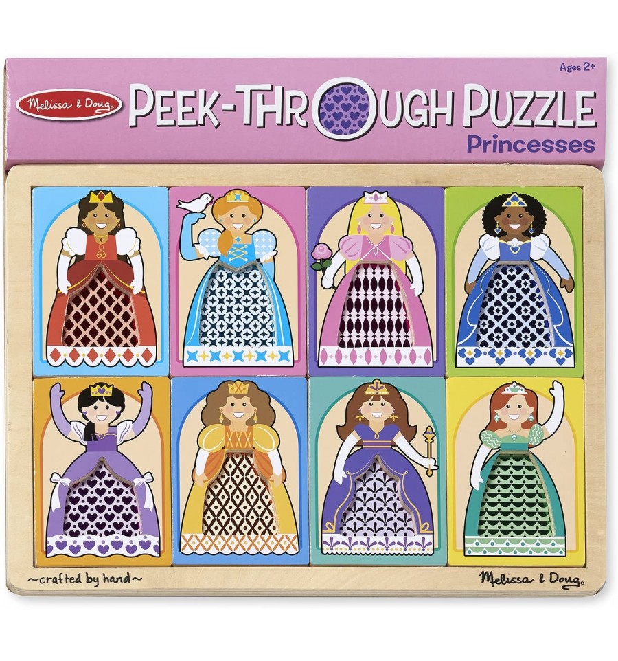 Ξύλινο πάζλ 9 τεμαχίων, με τετράγωνα κομμάτια κομμένα εσωτερικά σε σχήματα φορέματος, που αντιστοιχούν στα μοτίβα της ξύλινης βάσης. Τα παιδιά προσπαθούν να λύσουν το πάζλ, βάζοντας τα τετράγωνα κομμάτια στα σωστά σχέδια σύμφωνα με τις αποχρώσεις ώστε να εμφανιστούν ολοκληρωμένα τα φορέματα των πριγκιπισσών. Στη συνέχεια θα τα μπερδέψουν για να φτιάξουν διάφορους συνδυασμούς