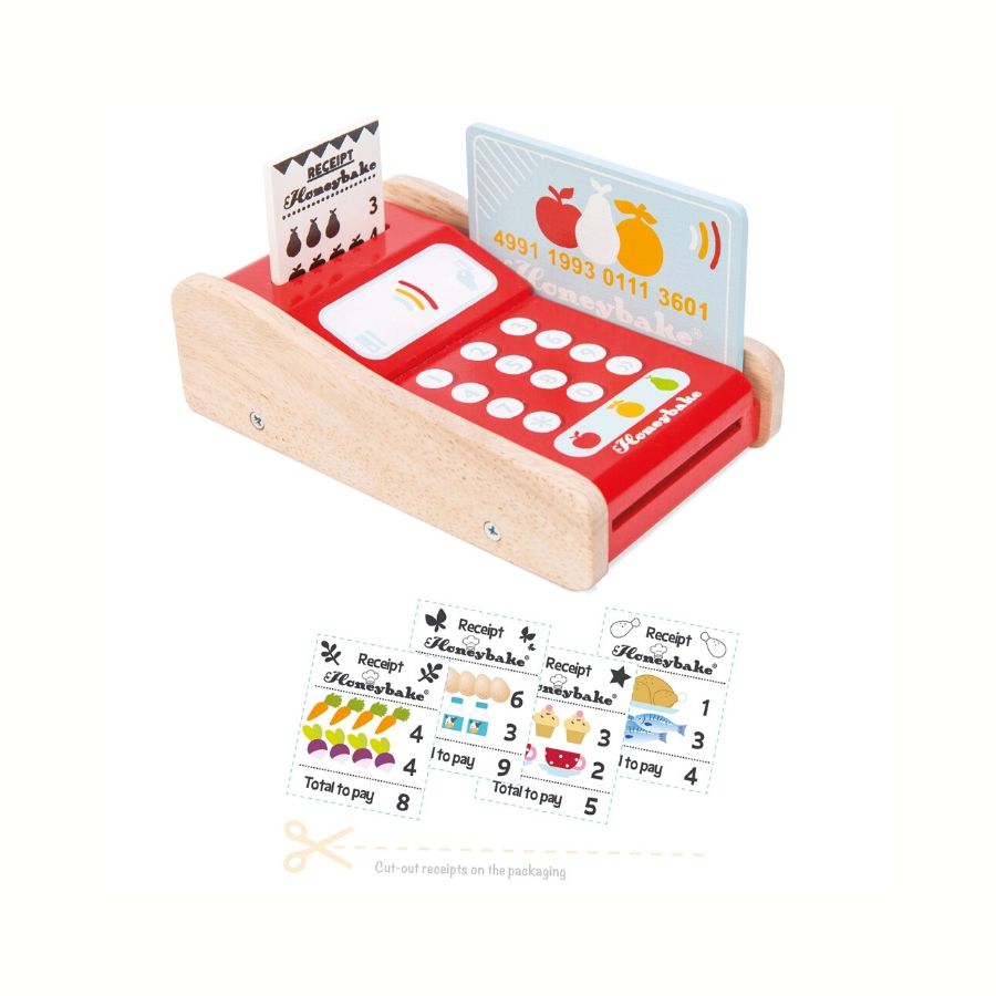 Ιδανική για κάθε αγορά παιχνιδιού, αυτή η μηχανή καρτών βοηθά τα παιδιά να βελτιώσουν τις αριθμητικές τους δεξιότητες παρέχοντας ταυτόχρονα την ευχαρίστηση να είναι υπεύθυνοι για τον δικό τους κόσμο. Βαμμένο για να ταιριάζει με τη συλλογή παιχνιδιών ρόλων Honeybake, αναμειγνύεται και ταιριάζει με τα υπόλοιπα της σειράς! Αποτελείται από ένα μηχάνημα, μία απόδειξη και μία κάρτα πληρωμής.