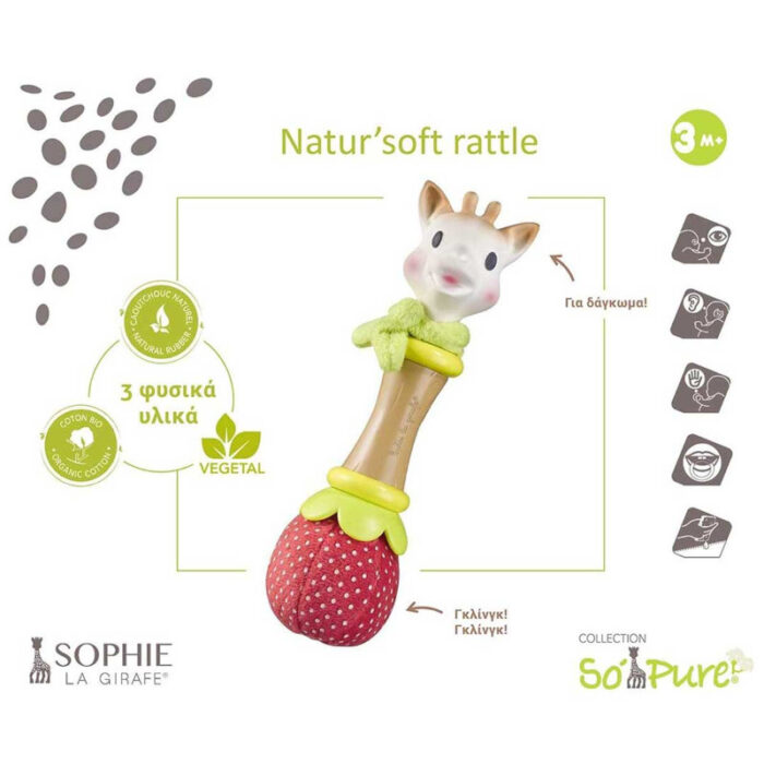 Είναι κατασκευασμένη από φυσικό καουτσούκ στο κεφάλι, το ύφασμα είναι οργανικό βαμβάκι και το υπόλοιπο σώμα είναι βιοπλαστικό. Το κεφάλι λειτουργεί σαν μασητικό καθώς είναι το ίδιο με της κλασικής Σόφι. Είναι πολύ εύκολο να την πιάνει με τα μικρά του χεράκια και κουνώντας της θα ακούει ένα διασκεδαστικό απαλό ήχο κουδουνίσματος! Κατάλληλη για βρέφη 3 μηνών και άνω.