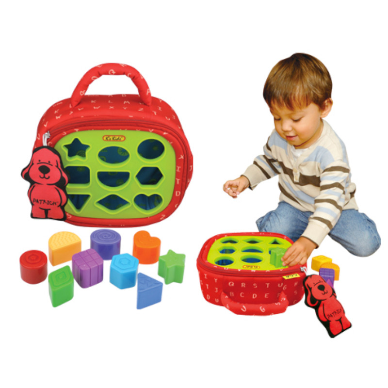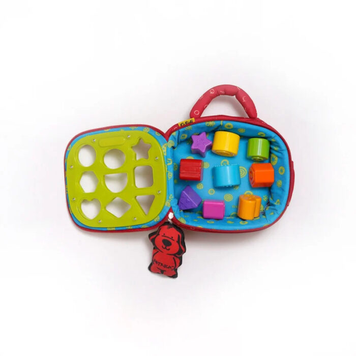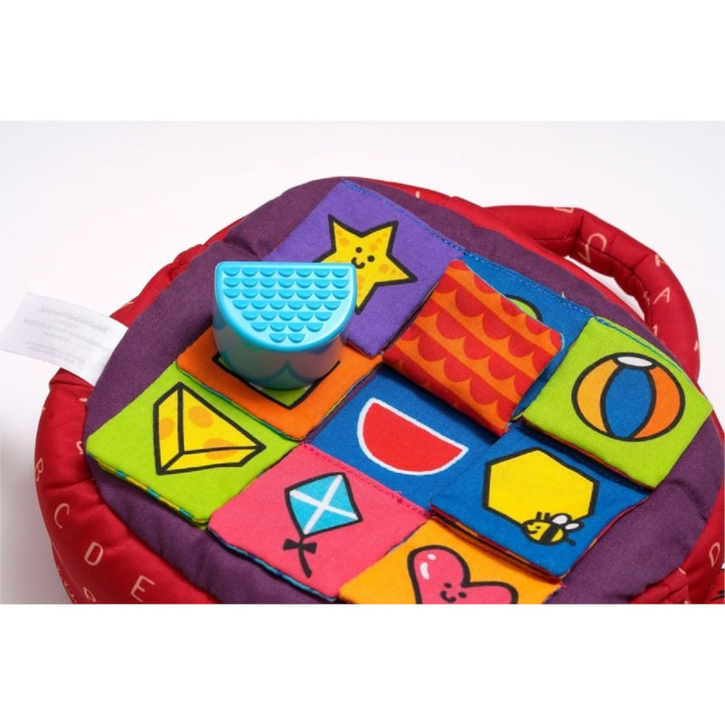 Ένα βαλιτσάκι εύκολο στη μεταφορά,έτσι το παιδί μπορει να απασχοληθεί παντού. Θ α προσπαθήσει νβα ταιριάξει τα διαφορετικά σχήματα στη μία πλευρά του παιχνιδιού.Από την άλλη πλευρά που είαιναι υφασμάτιονη , κρύβουν εκπλήξεις τα 9 παραθυράκια, με ήχους και πολύχρωμες εικόνες.
