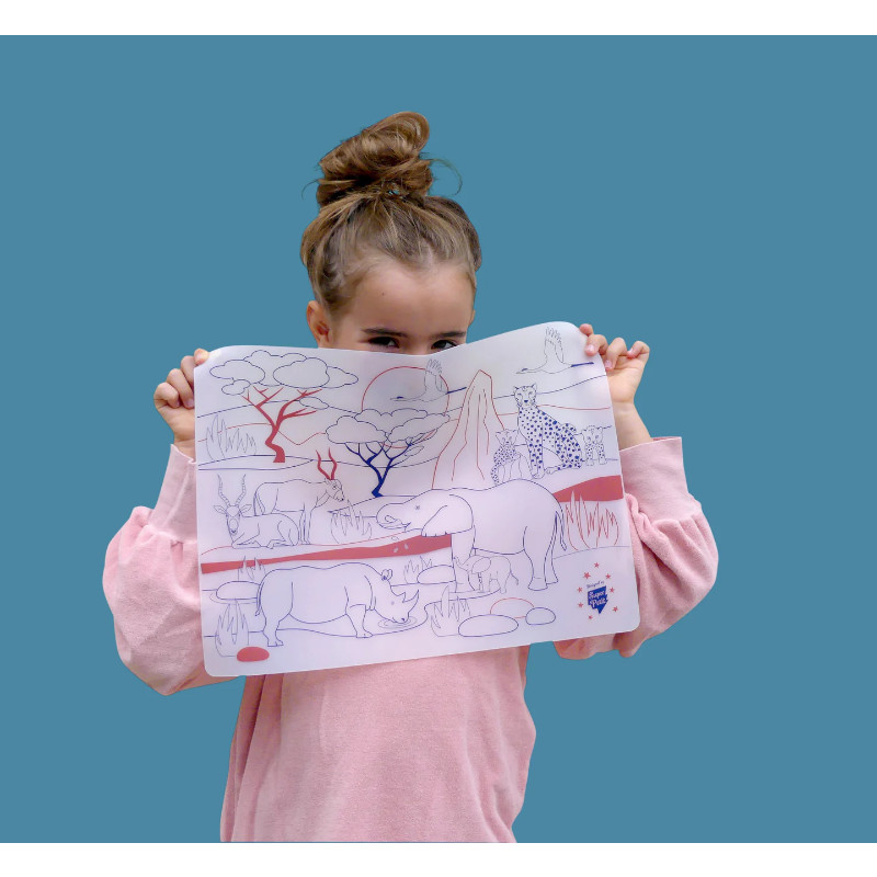Εξερευνήστε την αφρικανική σαβάννα με τα εντυπωσιακά ζώα και φύση..Η ώρα του γεύματος γίνεται super συναρπαστική με τα επαναχρησιμοποιούμενα σουπλά ζωγραφικής από 100% food-grade μαλακή σιλικόνη που έρχονται με 5, απολύτως ασφαλή για τα παιδιά, μαρκαδόρους που σβήνουν απλά με ένα…πανί!!!